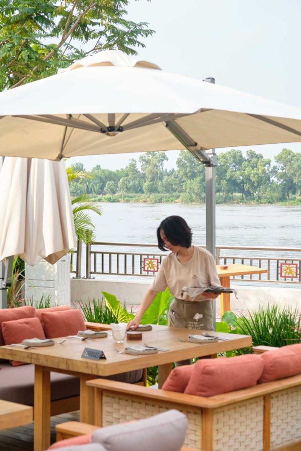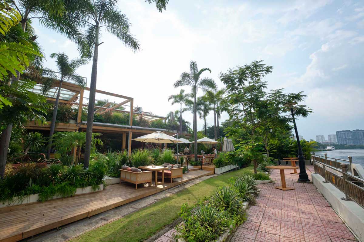 ランチやカフェタイムなど、日中の利用でもテラス席は人気。自然に囲まれた空間で、眼前に流れるサイゴン川をのんびり眺める。それだけでも心からリラックスできること確実です。