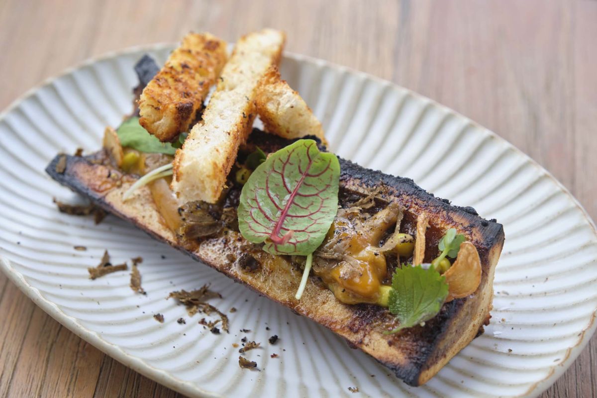 店の代表料理ともいえる「BONE MARROW(牛の骨髄の味噌ソース焼き)」29万VND。半分に割った骨に味噌やウニなどの和の食材を塗り豪快に焼きあげた一品。濃厚な骨髄の旨味をカリカリのトーストにつけ味わって。