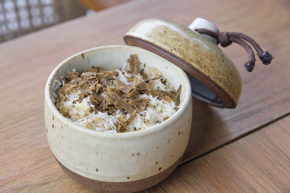 サイドディッシュには、土鍋で仕上げた「TRUFFLE RICE CLAY POT(トリュフライス)」9万8000VNDを。蓋を開けると芳醇なトリュフの香りがふわりと広がる上品な一品。ふりかけられたパルメザンチーズの塩味もほどよいアクセントに。