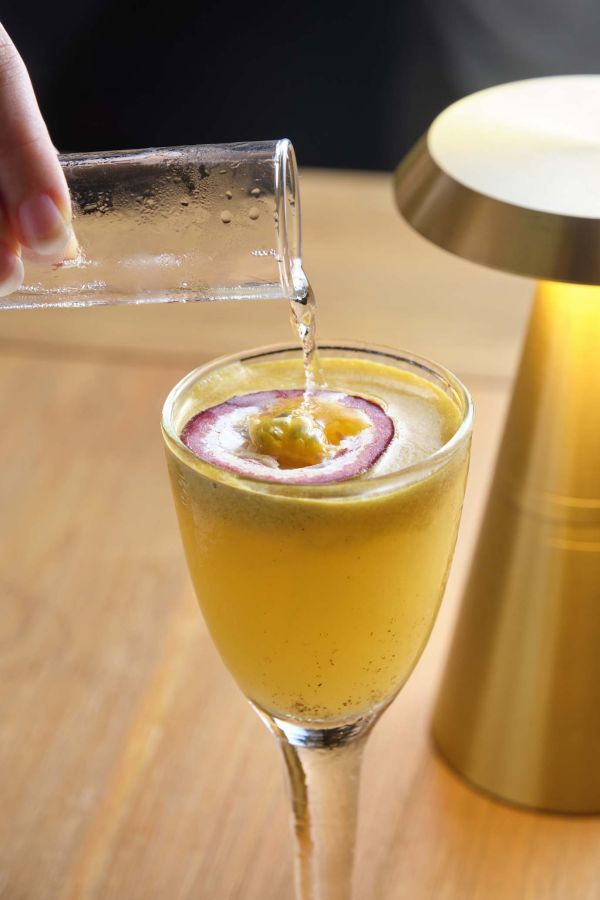 パッションフルーツの爽やかな香りが特徴の「PORNSTAR MARTINI(ポーンスター・マティーニ)」16万8000VND。飲む前に添えられる別グラスのシャンパンを注ぎ入れて完成!