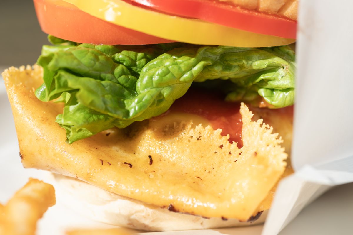高さのあるバーガーをぎゅっと包んで、大胆にかぶりつきましょう!