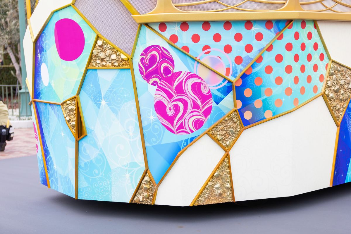 ハートがいっぱいデザインされたフロートには、よく見ると隠れミッキーもデザインされています。