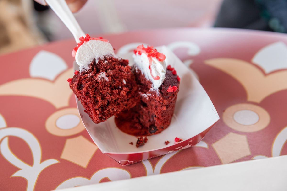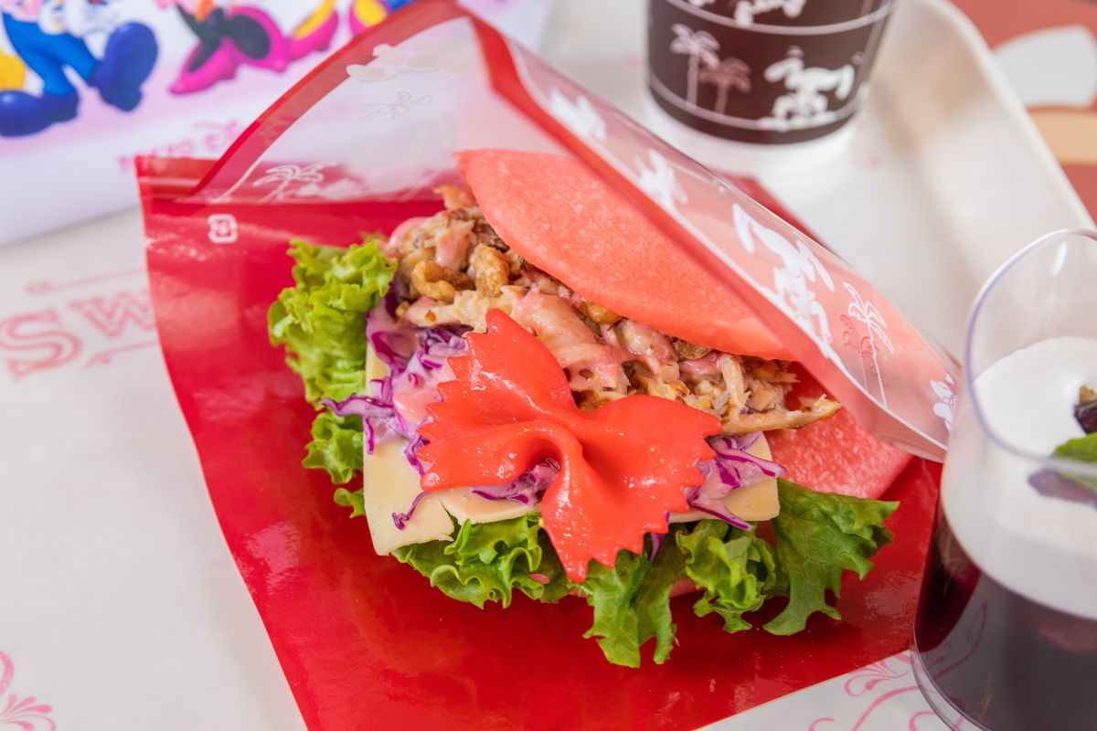 ホットドッグが食べられる「リフレッシュメントコーナー」では赤いパンとモッツァレラチーズでミニーのドレスをイメージしたスペシャルメニューが食べられます。