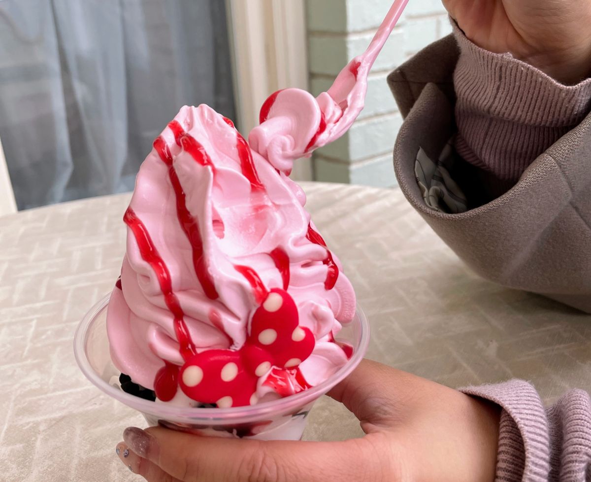 トップには雑味のないイチゴのソフトクリームと酸味のあるベリーソースがたっぷり。食べ進めると、さっぱりとした味わいのヨーグルトとビター味で粒状のココアクッキー、マシュマロが出てきて、食感に変化も。一番底にはイチゴの果肉も入ったストロベリーソースと、1つでいろんな味わいが楽しめました。これで780円は超おすすめ。寒い日でも味わいたいメニューです。