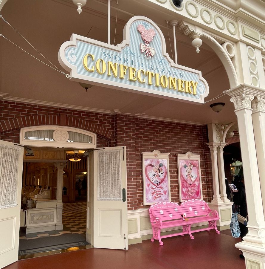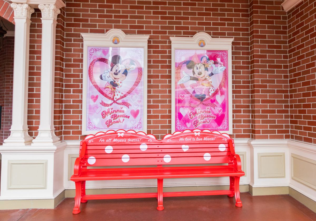 ワールドバザール入口の両サイドに、ミニーのポスターとピンクと赤のベンチを設置。座って記念撮影するもよし、ミニーのぬいぐるみを座らせて撮影するもよし。楽しみ方はいろいろです。