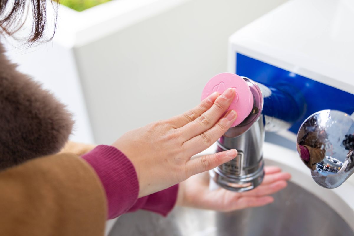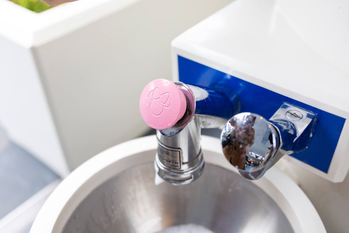 「ミニー・べスティーズ・バッシュ!」の期間中はリボンがついたミニー形にバージョン変更。泡を出すボタンもピンクに変更されています。手を洗う水があたたかいのもうれしい!