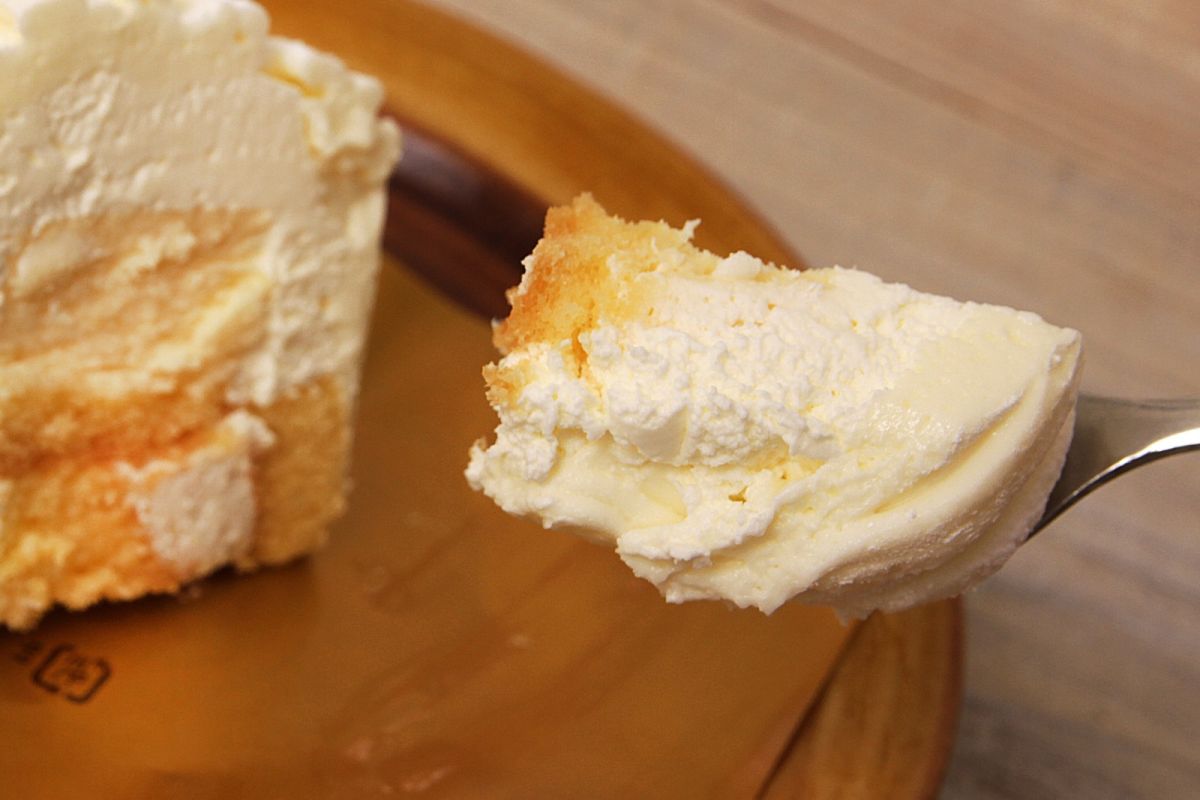 上からフォークですくって一口食べてみると、さわやかな酸味のあるチーズクリームの味わいが楽しめます。さらに下のホイップクリームと一緒に食べると、ふんわりと程よい甘みがプラスされ、軽やかな口どけ。食べ進むと濃厚なベイクドチーズケーキが登場! そして一番下は、しっとり優しい食感のロールケーキ。