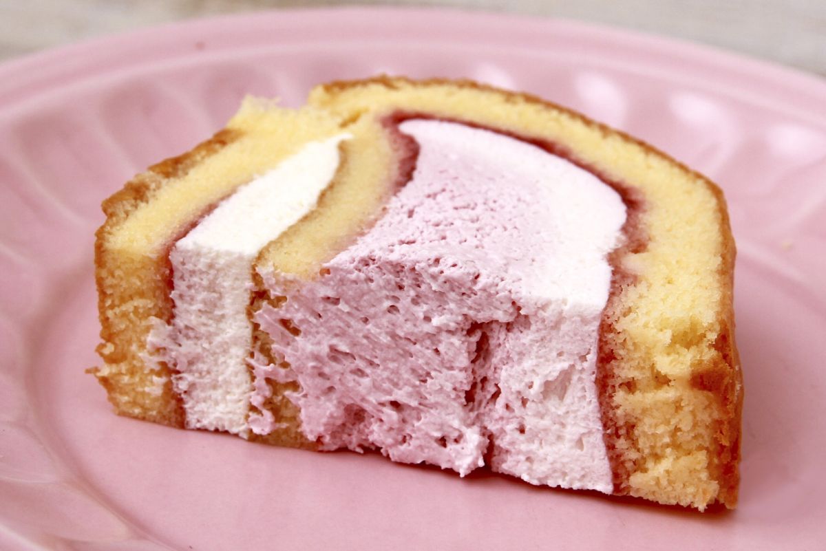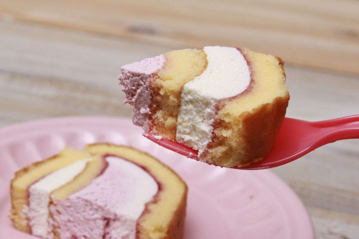 ロールケーキのスポンジの内側には、ハスカップソースが塗られていて、ほんのり赤く染まっています。クリームは外側が白く、中心がピンク色。ピンク色のクリームにもハスカップソースが入っているようです。