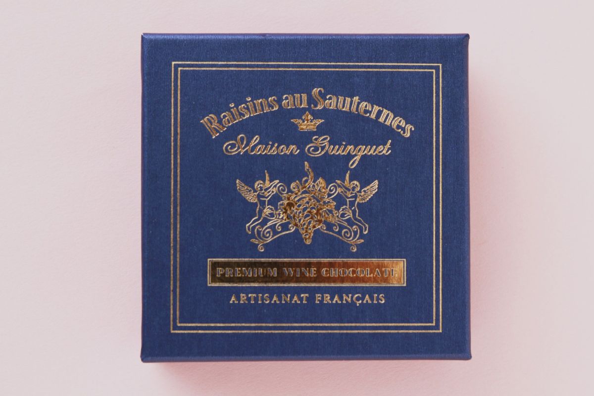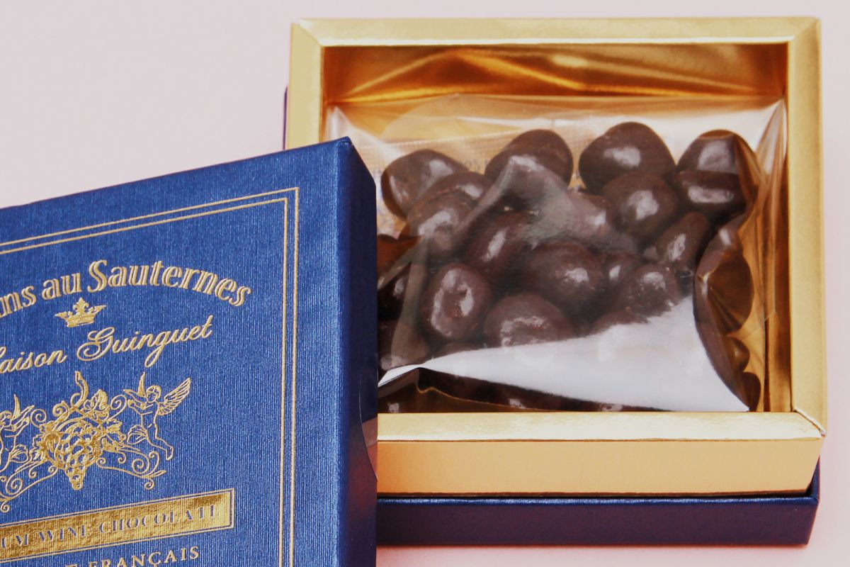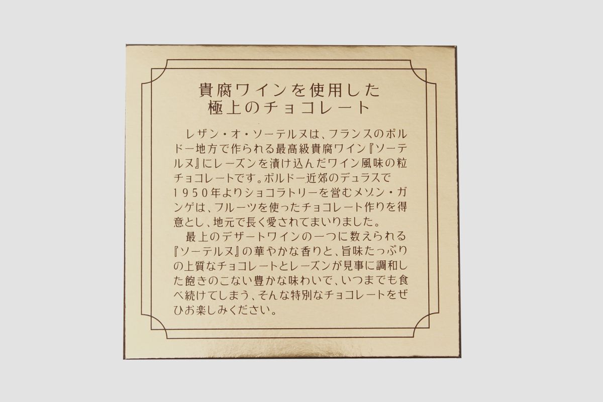 「メゾン・ガンゲ レザン・オ・ソーテルヌ」は、フランス・ボルドー産の貴腐ワイン「ソーテルヌ」にドライレーズンを漬け込み、チョコレートでコーティングした製品。