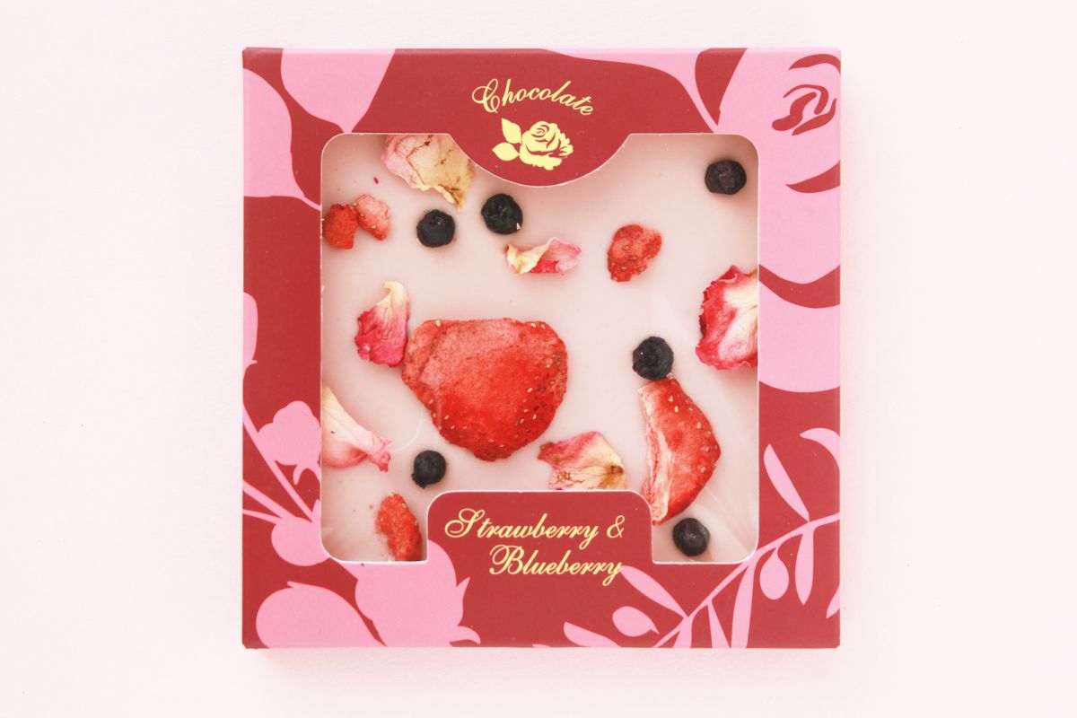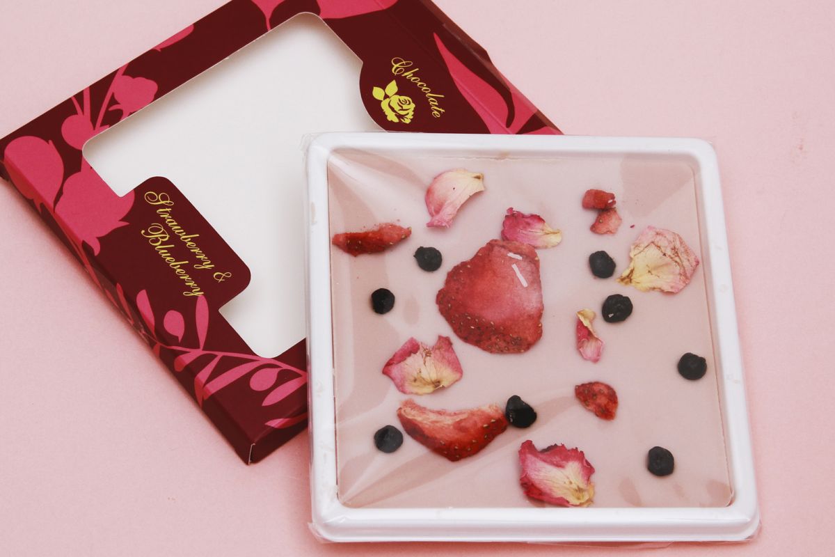バラの花びらのエキスを加えたホワイトチョコレートに、ドライフラワーになったバラの花びら、ドライストロベリーとブルーベリーがトッピングされています。端から割って食べてみると、口の中でチョコレートがまろやかにとろけ、華やかなローズの香りが広がります。