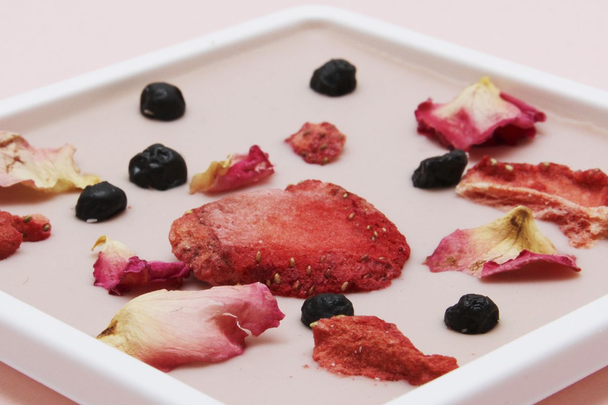 華やかなピンクのパッケージと、トッピングされたバラの花びらやドライストロベリーに乙女心がビビッときました。