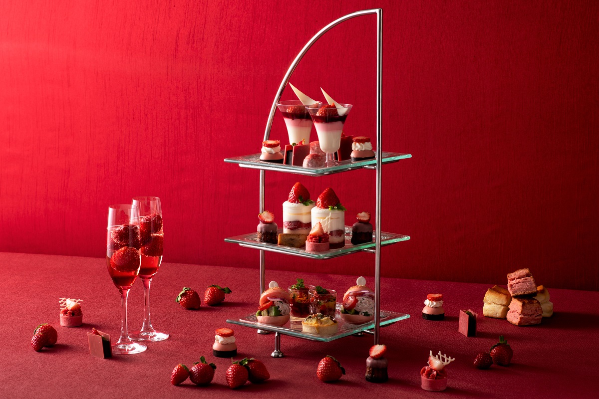 「とちおとめ」や「とちあいか」など選りすぐりのフレッシュないちごを贅沢に使用し、パティシエがひとつひとつ作り上げる8種のスイーツをはじめ、美しいビジュアルに心躍る “いちごづくし”のアイテムが3段のティースタンドに美しく並びます。パンナコッタやムース、タルトなどの定番アイテムに加え、パフェスタイルにアレンジしたいちごのショートケーキやスペインの菓子・ポルボロン、ルビーチョコレートを使ったフランス菓子・カヌレなどの新作アイテムも加わりました。