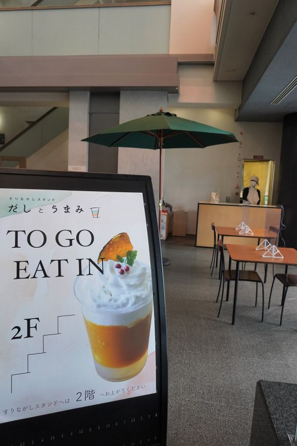 「すりながしスタンド だしとうまみ」へは、東館の正面玄関を入って奥の階段で2階へ。