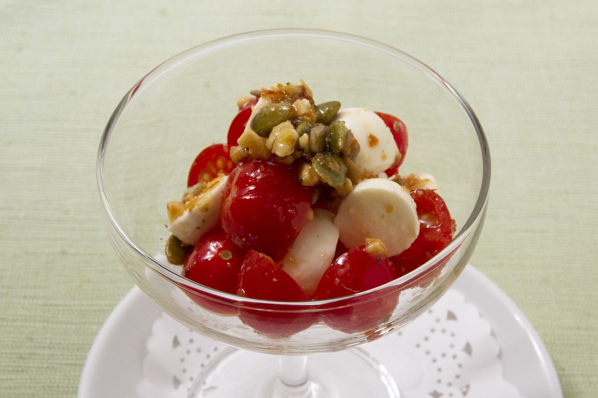 野菜やフルーツ高騰の折なので、今回は手軽なプチトマトを使用。それに合わせてモッツァレラチーズも小さいタイプを使用しました。 それぞれを半分に切り、「食べるナッツソース(バジル味)」を適量入れて和えればできあがり。お皿に盛り付けたときに、さらに少しだけナッツソースをトッピングしました。