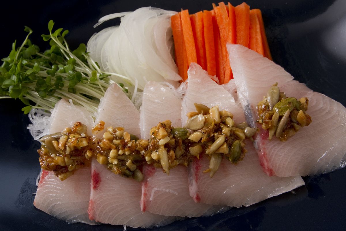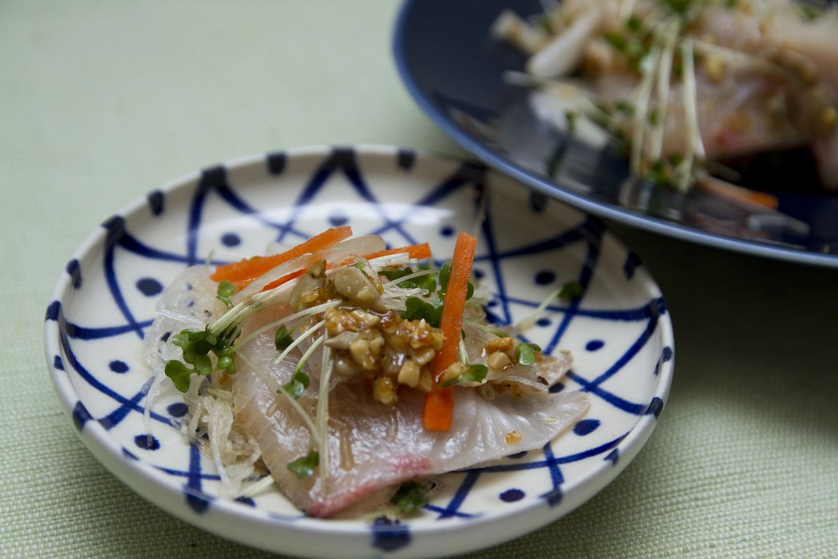 昔、中国料理店で食べたお刺身をヒントに作ってみました。その料理は大皿にタイやハマチなどの刺身を並べ、まわりに何種類もの千切り野菜と、砕いたピーナッツやカシューナッツ、揚げたワンタンの皮を盛り付けるというもの。そこにひまわり油などが入った特製醤油を回しかけ、お皿の上で全部を混ぜて食べるのですが、それはそれはおいしかった!と記憶しています。(現在は、そのお店ははありません)