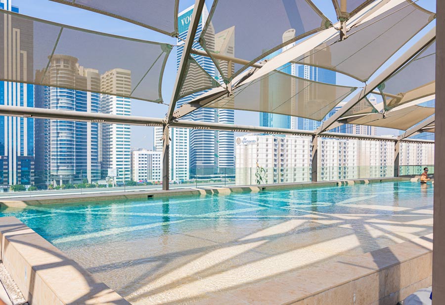 ホテルには屋外プールも。ドバイのメインストリートに面したプールでは大都会の高層ビルを眺めながらリフレッシュすることができます。