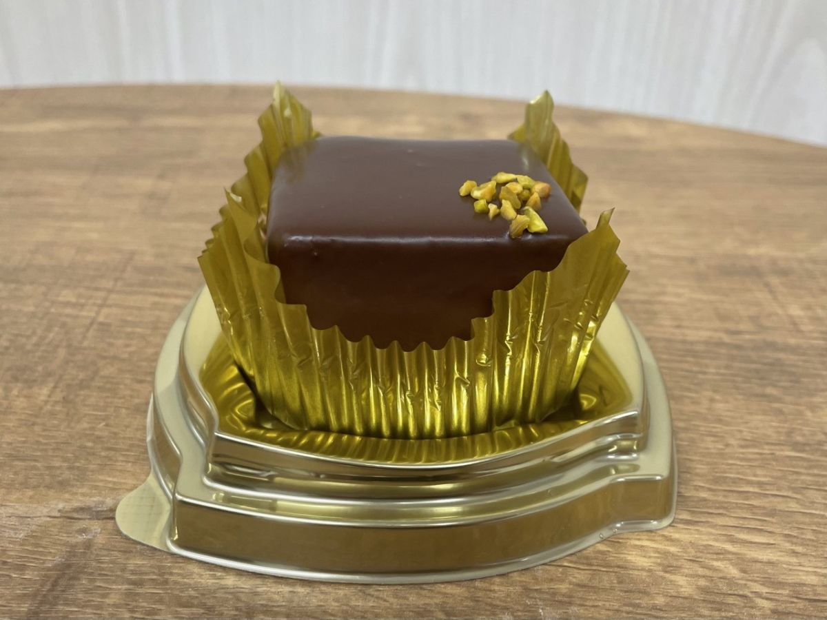 まず初めは「ショコラピスタチオ」320円。こちらはキューブ型の見た目が高級感を演出している美しい一品です。フォークを入れてみると、表面のチョコがなめらかでピスタチオクリームの層が見えてきます。食べてみると、香り豊かなチョコレートとピスタチオが相まって上品な味わいが感じられますよ。まるで洋菓子店のケーキを食べているような感覚に!ピスタチオ好きさんも歓喜のスイーツに仕上がっています。