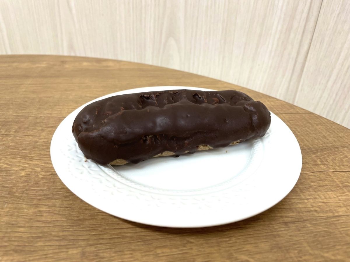 こちらは「濃厚ショコラエクレール」195円。コーティングは少しビターな味わいのチョコレートになっており、なかのチョコレートクリームは濃厚さが感じられます。しかもクリームがたっぷり詰まっていて満足感が高い!ボリューム感はあるけれど甘すぎず、最後まで飽きずにいただけます。