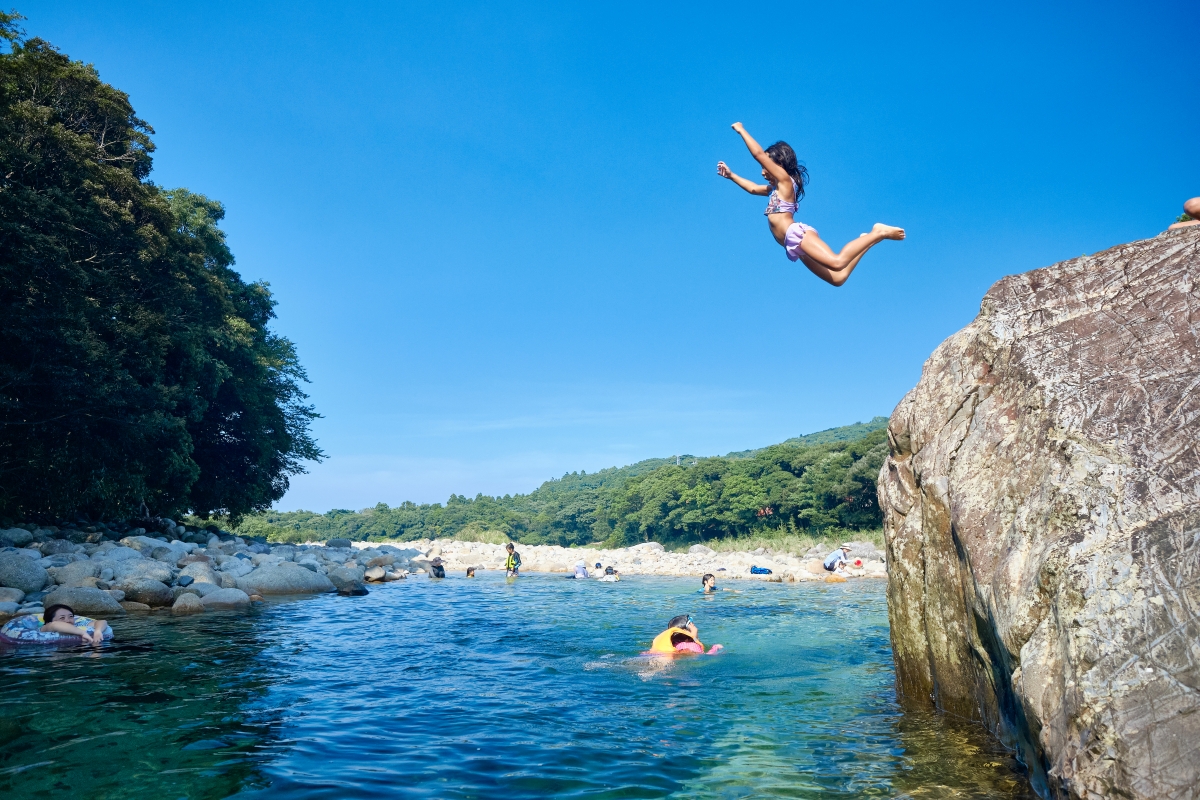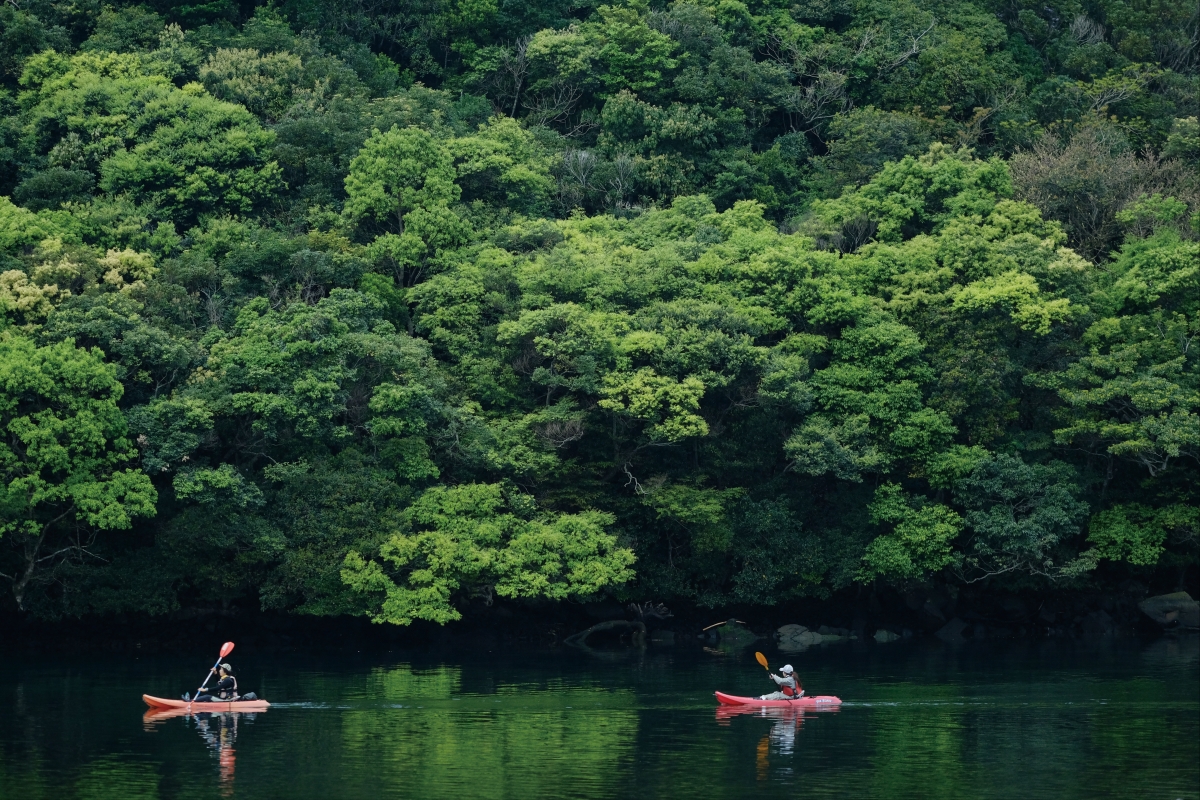 屋久島の川はまさに清流。屋久島で最も大きい川である安房川はリバーカヤックの人気スポットです。安房川の上流へ向かってカヤックをこいでいくと、V字渓谷といわれる照葉樹の森を通過していくような光景が広がります。岩場から川への飛び込みスポットや、水の音を聞きながら岩の上でお昼寝できるスポットなど、屋久島の水の循環と一体化できるスポットに立ち寄ることもできます。
