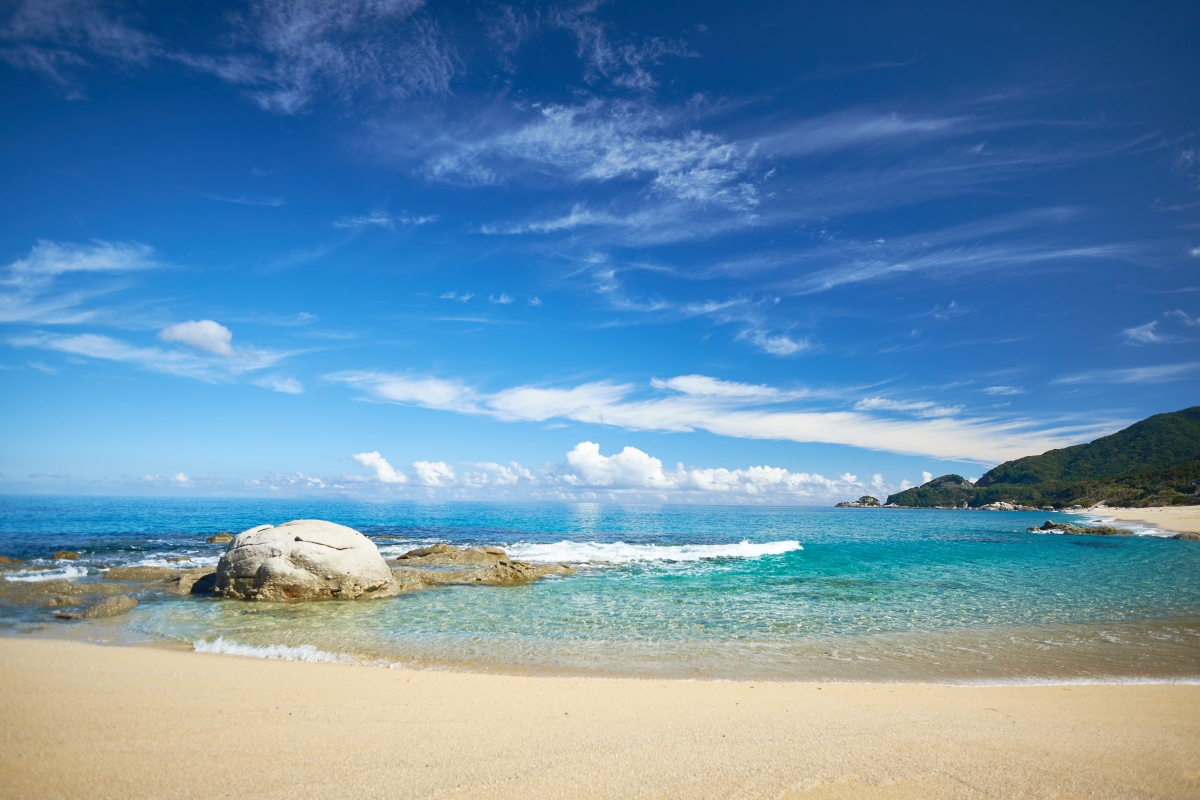 屋久島の北部にある永田の「いなか浜」はウミガメ上陸数が日本一の綺麗で穏やかな砂浜です。白く輝く粒の大きい砂浜で、かわいらしい貝殻を集めたり、ぼーっと夕陽を眺めたりするのもおすすめです。