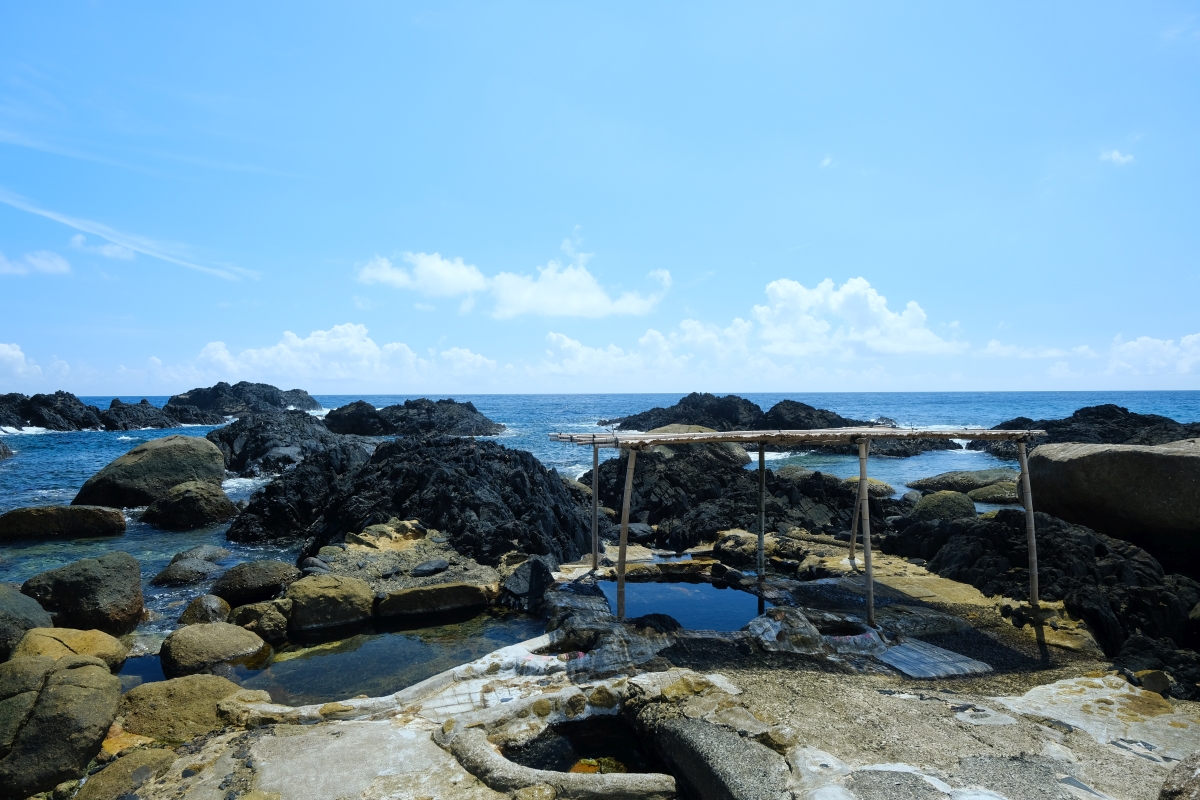 「平内海中温泉」は干潮前後の約2時間のみ入浴可能な、海の中から湧き出してくる珍しい温泉です。昼間は黒潮の影響を感じる色濃い海を、夜には満点の星空を楽しめます。