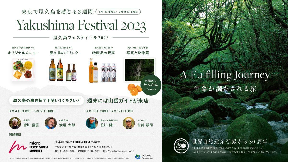 屋久島は、鹿児島県の南に位置する離島で、1993年に日本で初めて世界自然遺産に登録されました。登録から30周年を迎える今年、有楽町micro FOOD&IDEA marketにて、2023年3月1日(水)から3月15日(水)まで「屋久島フェスティバル2023」を開催します。