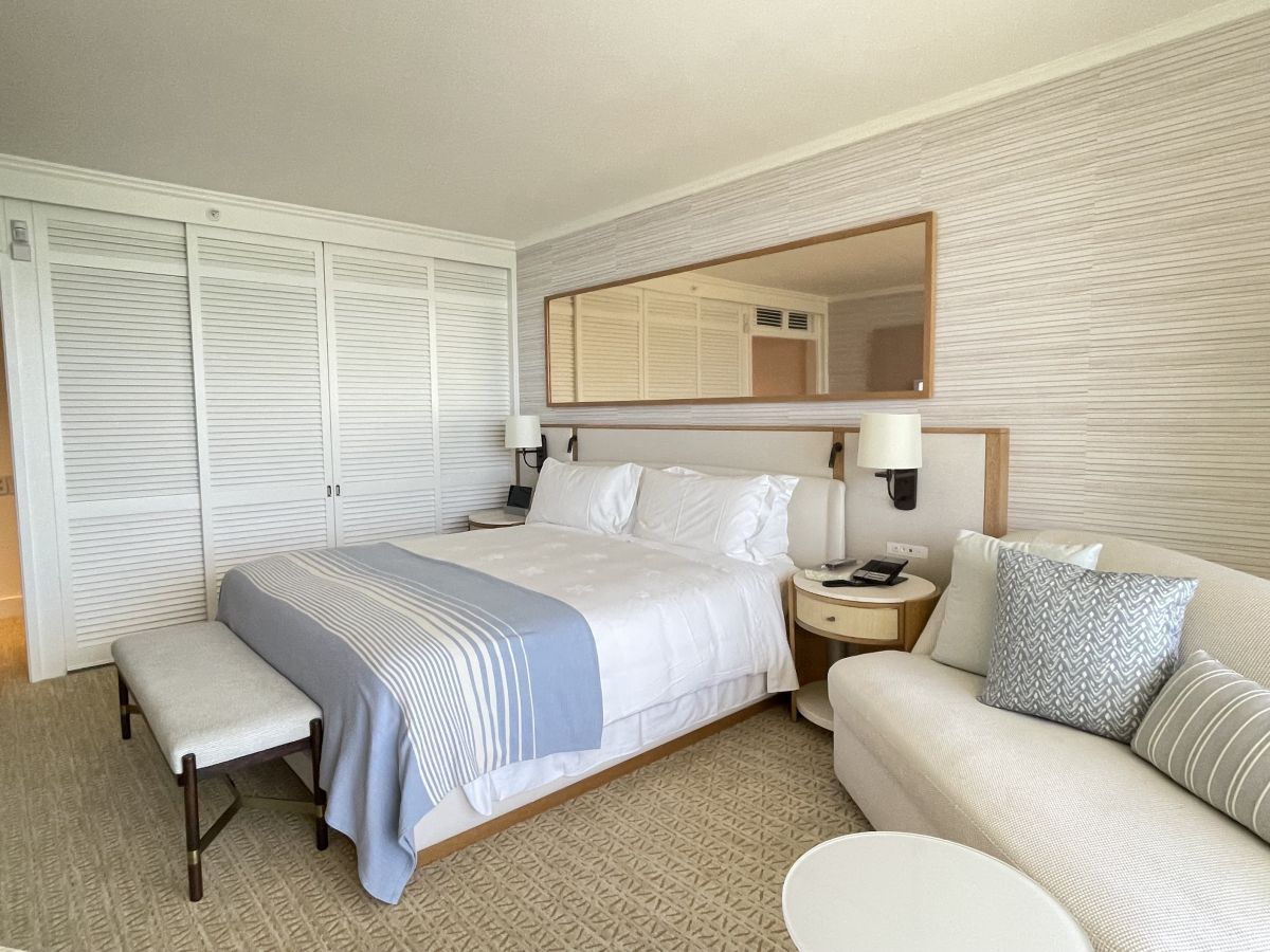 「ハレクラニ」には、ダイヤモンドヘッドタワー、マウカタワー、マカイタワー、エヴァタワーの4つの棟があり、中庭、ワイキキの海、ダイヤモンドヘッドなどお部屋によりさまざまな眺望が楽しめます。今回の改装では、全453室のうち、プレミアスイートを除く全ての客室が改装されました。今回はマウカタワーのオーシャンフロントのお部屋をご紹介します。