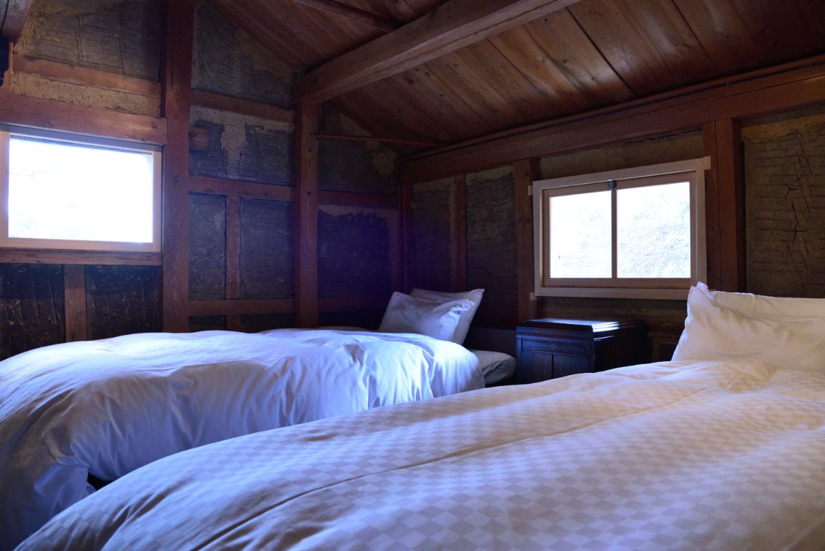 蔵を改装したメゾネットタイプは2室あり、「陽炎(かぎろひ)」は欅の梁があるシックな空間、「古楽(こらく)」は土壁をそのまま生かした荒々しくも温かみのある雰囲気が特徴です。
