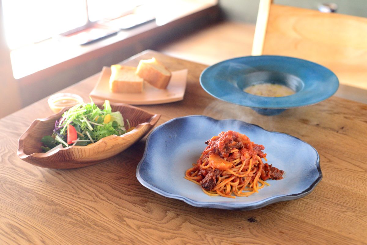 宿泊者以外も利用できるランチは、朝どれ野菜たっぷりのサラダと、前菜盛り合わせ、スープ、パスタ、デザートがセットになった「やをらコース」3850円、肉料理付きの「たまひコース」6600円もあります。「やをらコース」のパスタは宇陀牛を使ったものと、季節野菜のパスタの2種類から選択可能。今回選んだパスタは宇陀牛とカブのラグーソース。ゴロゴロ入った牛肉と、とろけるようなカブの食感がたまりません。驚いたのはフォカッチャのおいしさ。もっちりしっとり、噛めば噛むほど香ばしい味わいです。