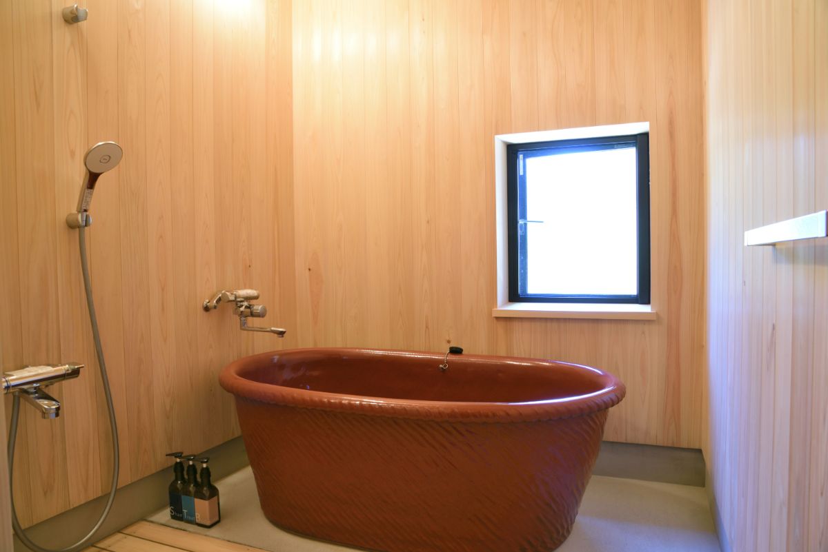 「薬湯の宿」の名が付くとおり、風呂は薬草「大和当帰(やまととうき)」を配合した自家製入浴剤を入れて入浴します。客室ごとに違う信楽焼の陶製風呂釜がとてもおしゃれ。旅の疲れが癒やされるバスタイムを過ごせます。