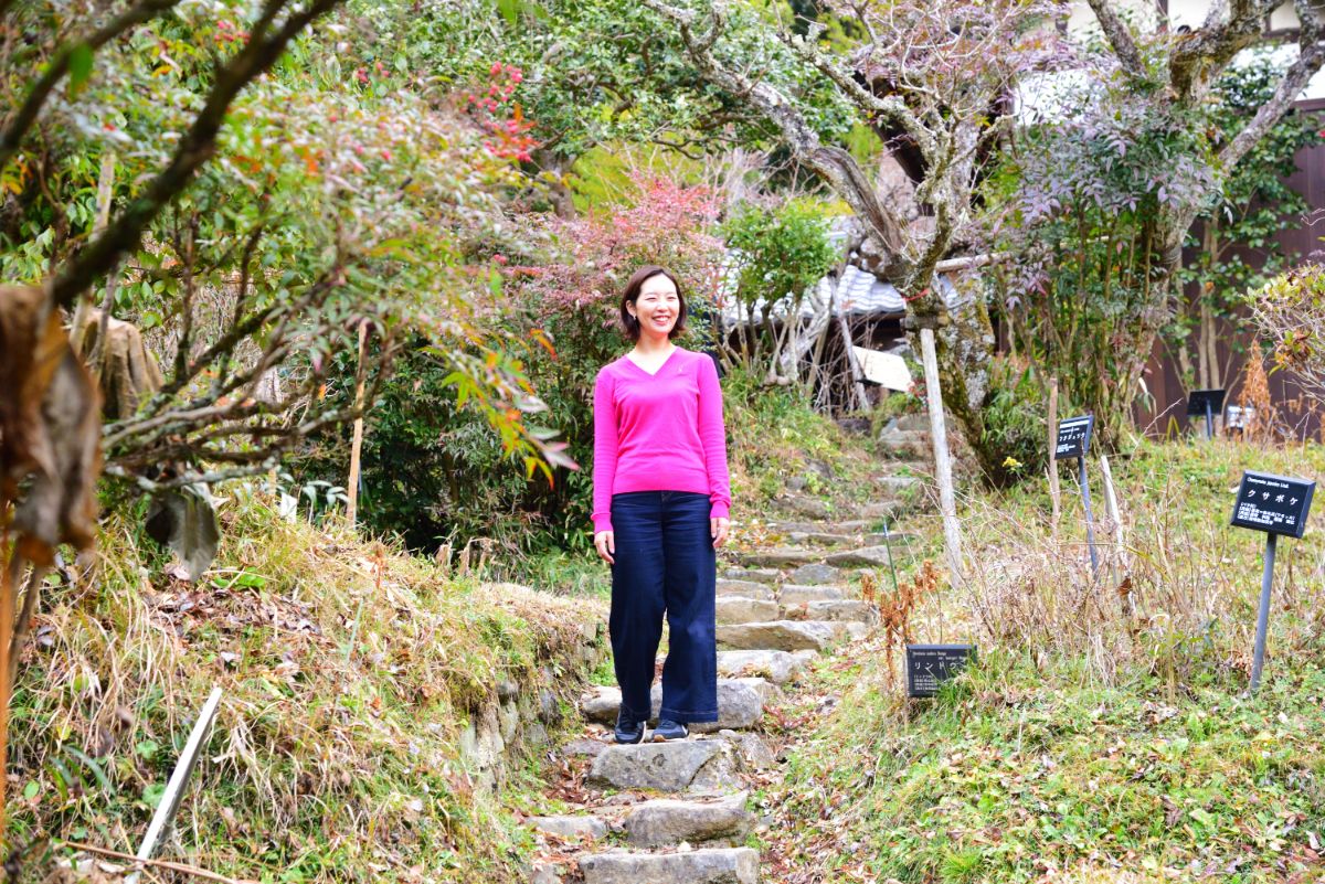 園内は急な石段を上る小高い山で、道々ではおよそ250種類もの薬草を観察できます。赤色ではないシロナンテン、樹齢300年ほどの花の木、群生のカタクリなど、右にも左にも珍しい草木があり、植物観察に興じることができます。