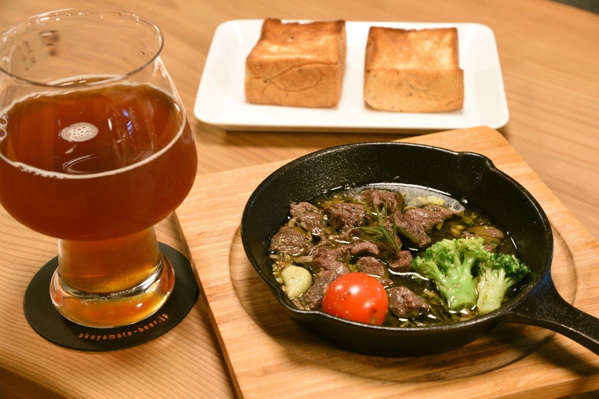 ビールは定番が3種類、季節限定が5~6種類揃います。初めて訪れた人には、「奥大和ビール 定番3種飲み比べセット」グラス1199円、瓶2013円がおすすめ。カモミールなどのハーブの香りが印象的な「アロマホワイト」と、ドライな琥珀ビール「ハーバルエール」、ほろ苦い黒ビール「スパイスダーク」が味わえます。