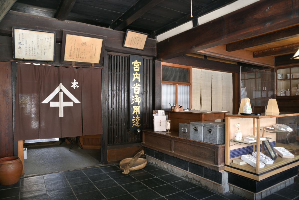 店の中に入ると、「宮内省御用達」と書かれた大きな看板が目にとまります。「当時京都にいた道安は吉野から葛根を取り寄せて葛粉を作り、朝廷に献上。その後宇陀松山に移住し、明治時代に宮内省御用達となったという歴史があります」と黒川さん。葛湯は昭和天皇がご愛飲していたそうです。