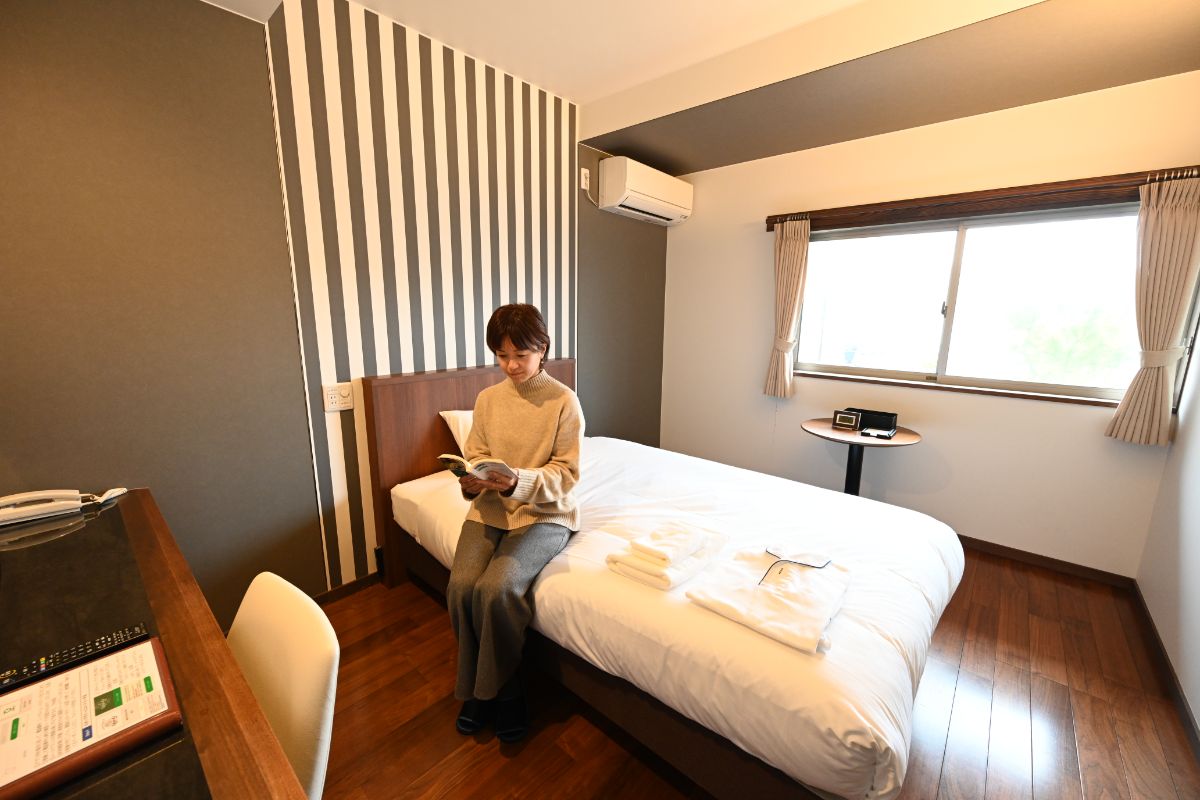 写真の「HARBORVIEW SINGLE(ハーバービューシングル)」は海が一望できる客室。ブラウンベースのモダンな洋室で、全室にトイレとシャワールーム、Wi-Fiを完備。今治製のバスタオルや部屋着、歯ブラシなどのアメニティも揃っていて、快適に過ごせます。シングル5部屋にツインが1部屋となっているので、ひとり旅や、島に滞在しながらリモートワークという使い方にもぴったり。窓から外を眺めて、港町気分を満喫しましょう。