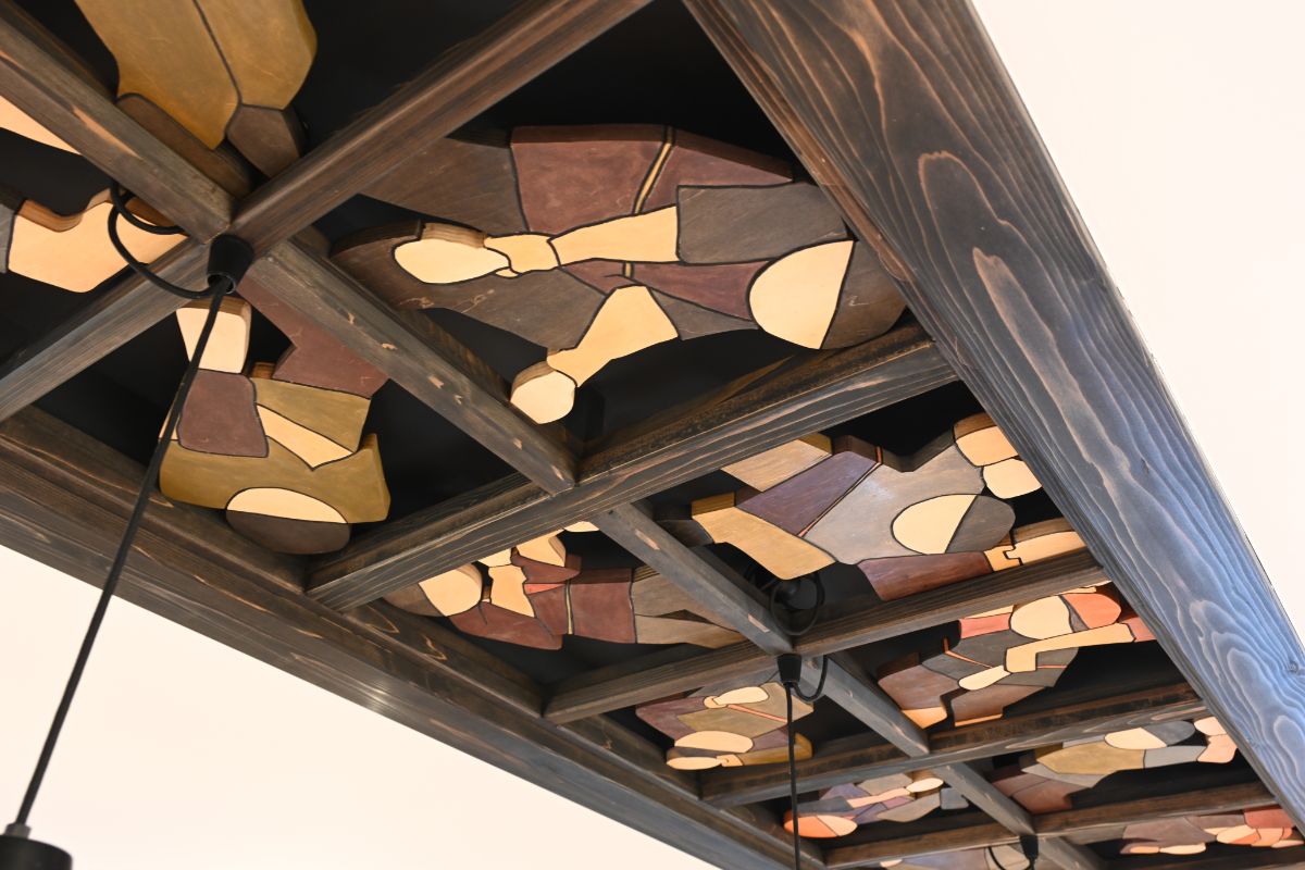 共有スペースのダイニングの天井もその一つ。しゃもじを持って踊る様子を表した木彫りの飾りは、海士町発祥の隠岐民謡「きんにゃもにゃ」を表現したもの。見ているだけでなんだか楽しい気分になってきます。