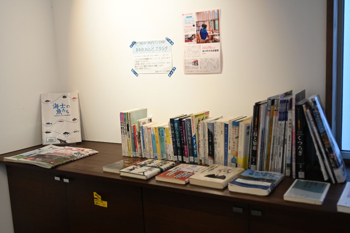 エントランスには隠岐の自然や人、歴史に関する本をはじめ、雑誌やジオパークの資料が揃っています。実はこのスペースは海士町の町立図書館のコーナーで、本は客室に持って行って読むことができます。海士町では島のさまざまな場所に本を置く「島まるごと図書館」というプロジェクトを進めているので、島内の立ち寄った先でも本との出合いが待っているかもしれません。