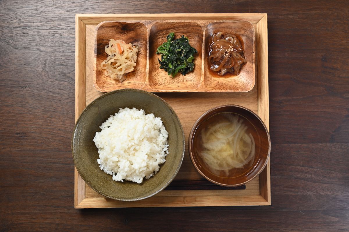 朝食はチェックインの時に希望の時間を伝えておきます。地元で育てたコシヒカリ「海士の本氣米」を炊いたツヤツヤのご飯に、温かい味噌汁など、宿のキッチンで作られた、できたての朝食がいただけます。海士町は離島では珍しく湧き水が豊富なため、稲作が盛んで、お米の味もとてもおいしいんです。ご飯のお供は、隠岐の郷土料理であるシマメ(イカの醬油漬け)など3種の惣菜。惣菜は日替わりなので、連泊でも飽きません。食べるとほっこりする朝ごはんで、旅のエネルギーを充填して。