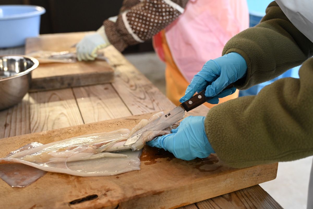 おみやげとしても大人気の海士町の名産「しぃしび」。「しぃしび」とは一夜干しのことで、島の沖合でとれた立派なイカを漁師さんに教わりながらさばいていきます。