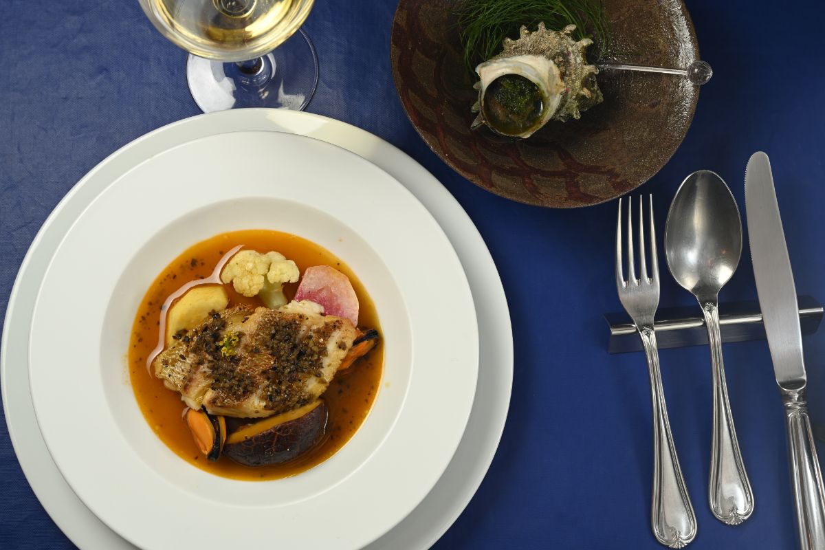 メインは「レンコ鯛のカチュッコ」。本来はイタリア版ブイヤベースといった煮込み料理ですが、「この魚は焼いた方がおいしいから」というシェフのアイデアでレンコ鯛はソテーし、客席で魚介のアツアツ濃厚なスープをかけるスタイルにアレンジ。海士町の魚がよりおいしくなる工夫を凝らした料理は、本場イタリアで学んだシェフの技が光ります。