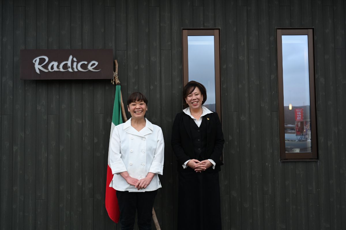 店はオーナーシェフの桑本千鶴さん(左)と、ソムリエの升田由美子さん(右)が切り盛りしています。おふたりはいとこ同士で、店でのサービスも息ぴったり! レストランのすぐ向かいには桑本さんのご実家の「ファミリーショップくわもと」があり、桑本さんが焼いたパンが販売されることもあるそうなので、立ち寄ってみてください。