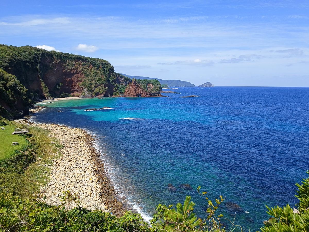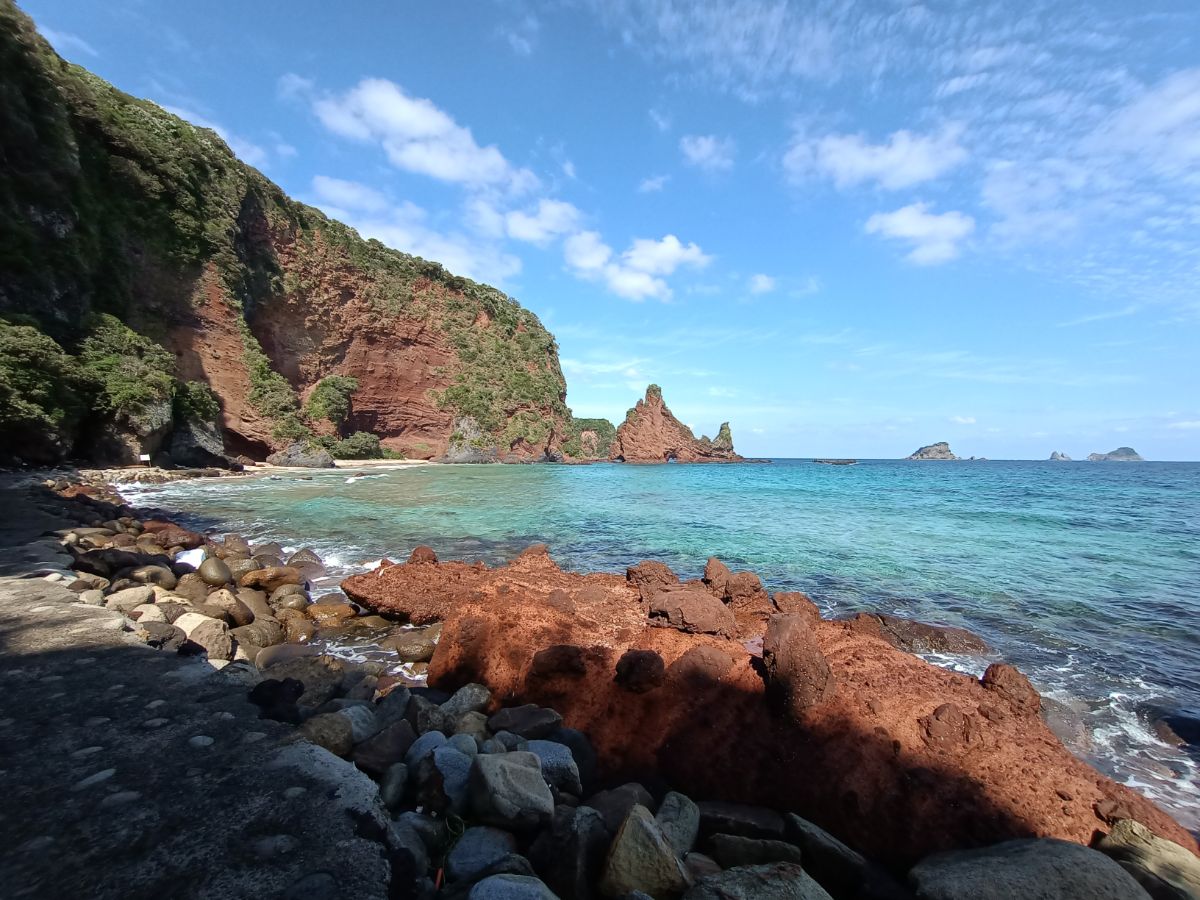 中ノ島の北東部に位置する「明屋海岸(あきやかいがん)」は、海士町きっての絶景&ジオスポット。海岸にそそり立つ崖の不思議なほどの赤が、はっと目に飛び込んできます。この大地は約280万年前の火山活動によって作られたそうで、多孔質のスコリアなどの火山物質が崖を赤く見せているのだとか。赤い崖と驚くほど透明度が高いエメラルドグリーンの海のコントラストは、ここだけの貴重な景色。「明屋海岸のスコリア丘」として「隠岐ユネスコ世界ジオパーク」に指定されています。