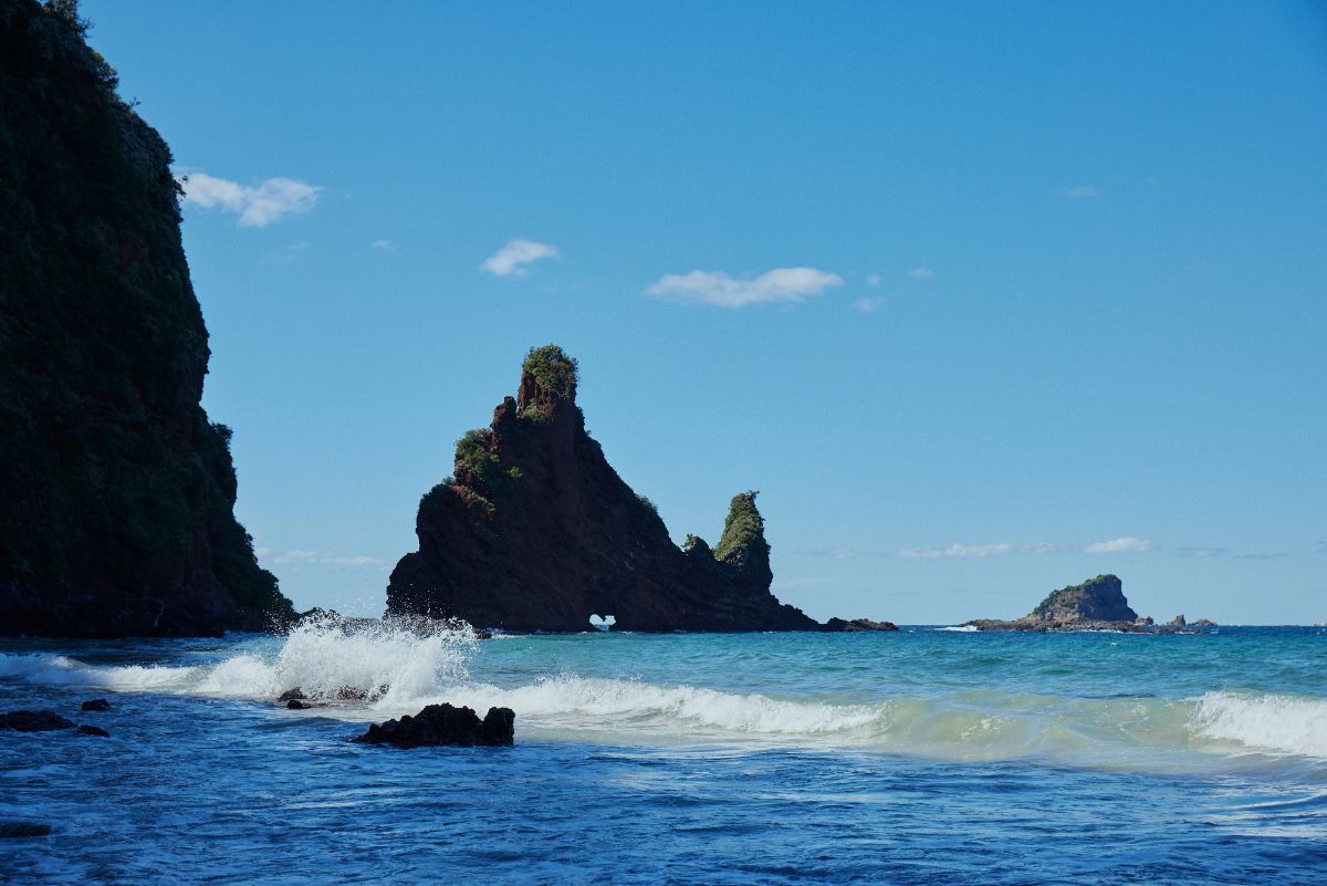 明屋海岸には、中ノ島の神様である宇受賀命(うづかのみこと)神と結婚した女神がお産をしたという伝説が残っています。その産屋とされる場所に「たらい岩」と「屏風岩」があり、「屏風岩」には遊歩道から近づくこともできます。この岩は、ハート型に穴があいた場所があることから「ハート岩」ともよばれ、伝説とハート岩の効果から、幸運や縁結びのパワースポットとして人気。「ハート岩」の恩恵を授かれるように、しっかりとお祈りをして帰りました。