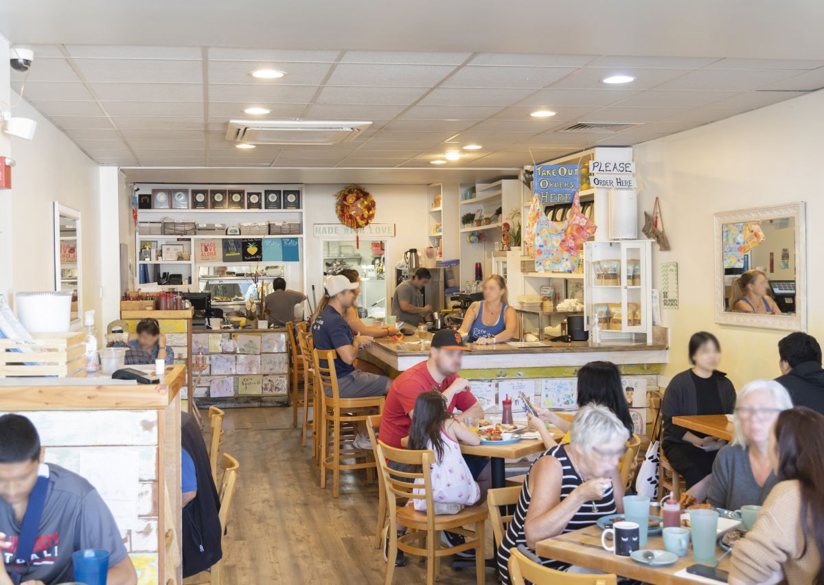 店内は明るくアットホームな雰囲気で居心地も抜群。Tシャツやビーチサンダルで気軽に立ち寄れるカジュアルさも大きな魅力です。おいしい朝食をリーズナブルな価格でいただけるとあって、午前7時の開店直後から地元の常連客たちで賑わっています。朝8時から10時には旅行者も加わりさらに混み合うので、ゆっくり食事を楽しみたい方は、午後1時~2時前後が狙い目です。