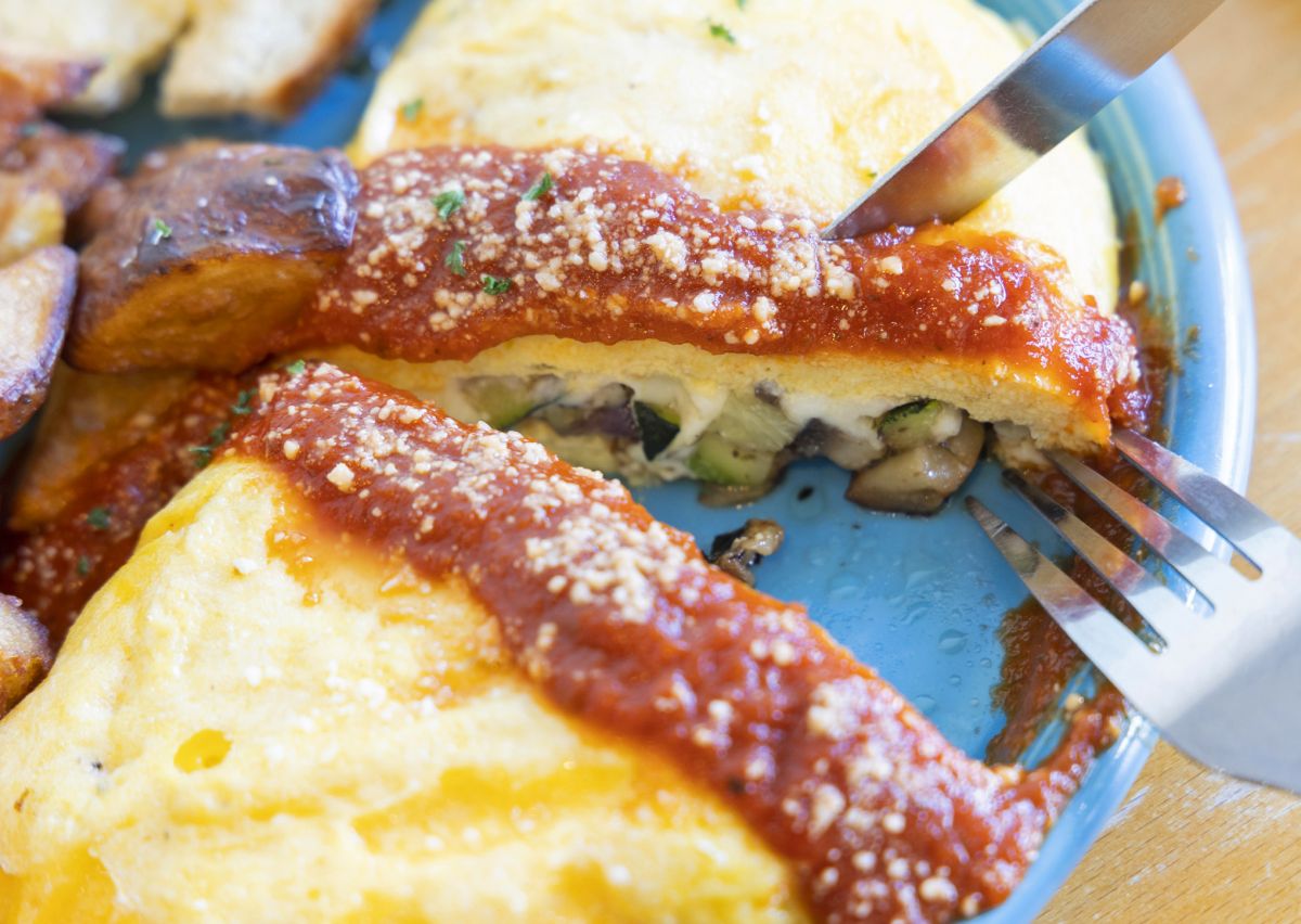ハワイ産のブランドたまご、カレイエッグを3個使用したオムレツの中には、ナス、ズッキーニ、マッシュルーム、モッツァレラチーズがぎっしり詰まっていて食べ応え抜群。マリナラソースとパルメザンチーズのトッピングもいいアクセントになっています。