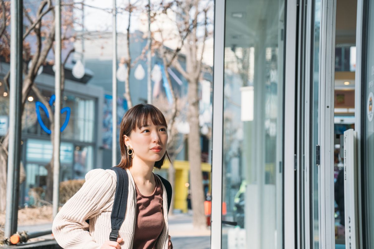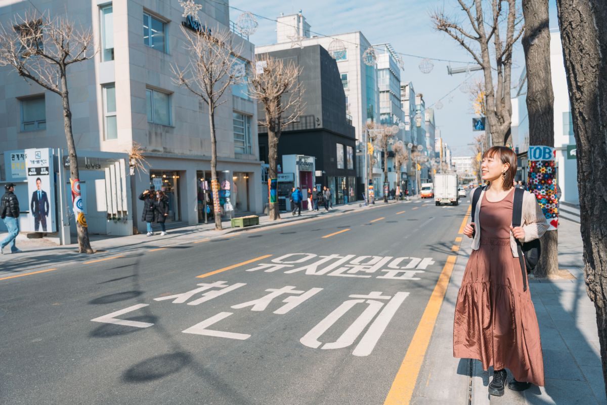 お茶をした後は、それぞれ行きたい場所を訪れるため、友だちといったん別行動。やってきたのは、洗練されたモダンな建物が多い「江南(カンナム)」エリアにある「カロスキル」。美しい街路樹に沿って、セレクトショップやカフェが立ち並ぶ通りです。裏通りにもおしゃれなお店がたくさんあるので、探索するのが楽しい!ウィンドウショッピングを楽しんだり、路地裏に入ってお店を探してみたり、自由気ままに散策♪