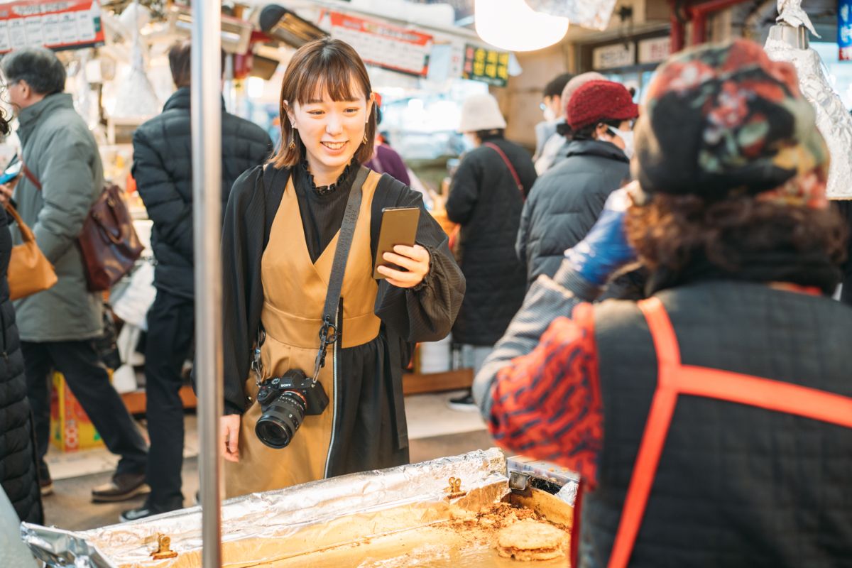 “じゅわ〜”と音がするほうに目を向けると、そこには黄金色に焼きあがる「ピンデトッ(緑豆チヂミ)」が。とってもおいしそうなので、こちらを注文することに。さっそくスマホの翻訳アプリを使い、屋台のスタッフにオーダーしたいと伝えると、「まず席を確保してほしい」とのこと。どうやら「広蔵市場」の屋台では、席を確保してからオーダーし、その後支払いをするのが基本ルールのようです。