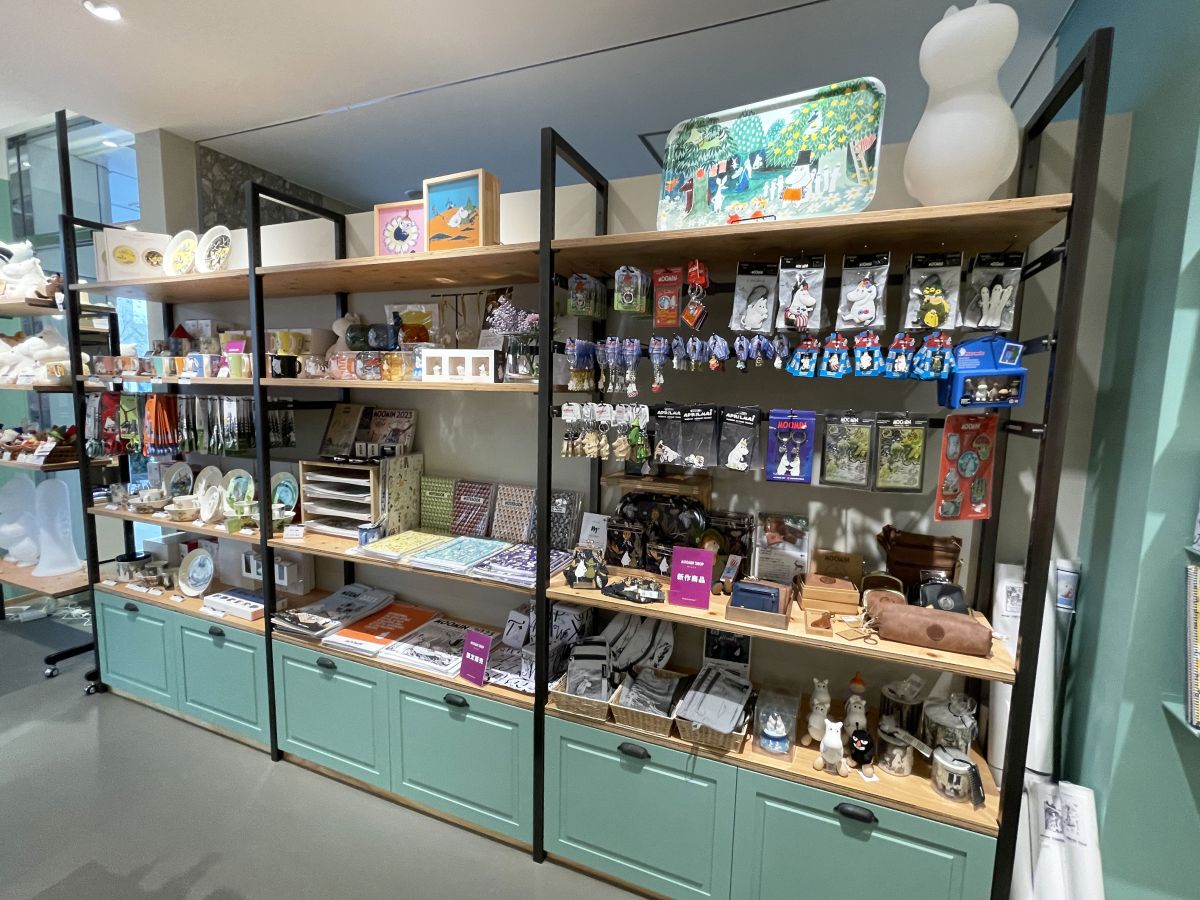 店内は、ムーミンの原作者であるトーベ・ヤンソンが絵本などのアートで好んで使用していたカラーのひとつであるセージグリーンがふんだんにあしらわれ、入ったとたん北欧らしい温かな雰囲気に包まれます。