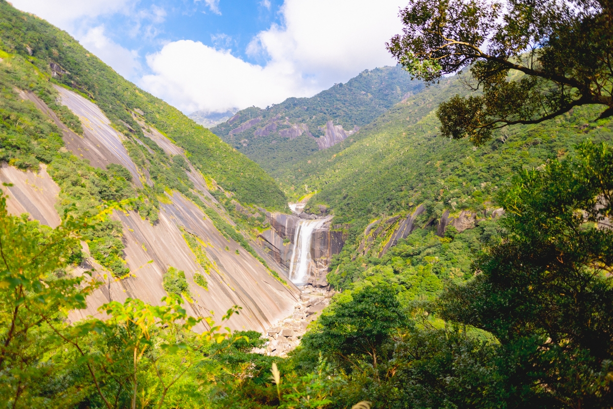 島の南東部に位置する「千尋の滝(せんぴろのたき)」も屋久島の雄大な自然を感じることのできるスポットです。写真は展望台からの景色。岩を鋭く刻む、落差約60mの滝を眺めます。ちなみに"一尋"とは、人が両手を伸ばしたときの長さ。そのため千尋は「千人が手を広げた長さ」で、滝が流れる一枚岩の大きさを表しています。