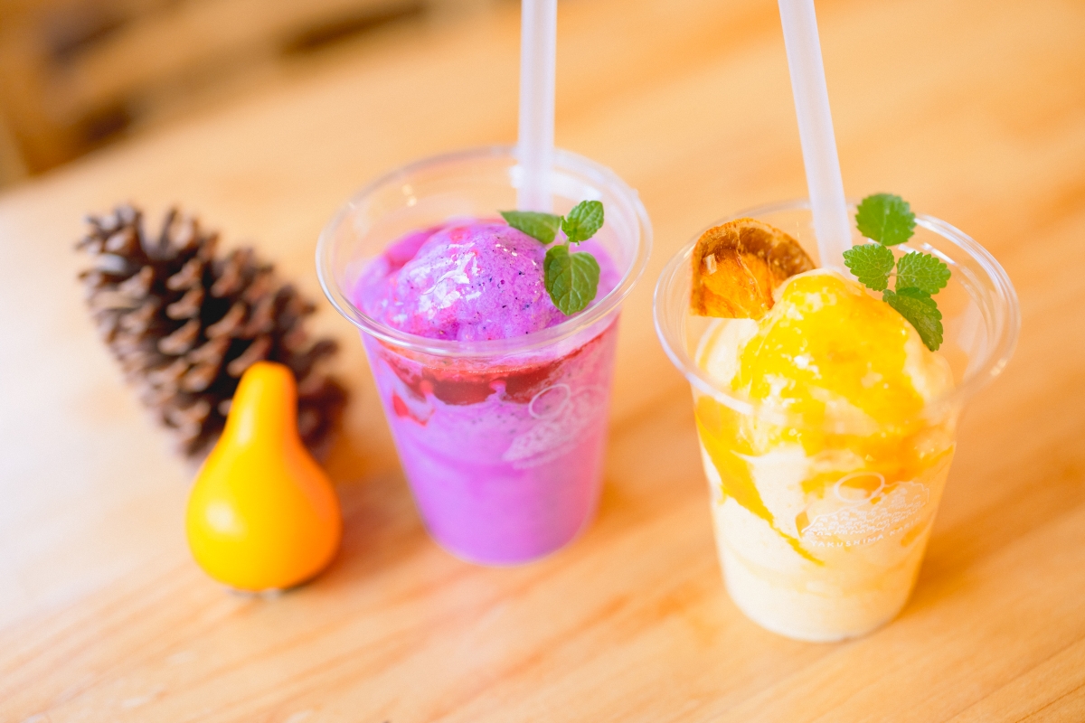 まずはスムージーが人気のカフェ「やくしま果鈴」。自家製のたんかんや、島の素材を日毎に替えて作られるスイーツがカラフル!フィナンシェやバスクチーズケーキなど、屋久島の素材で丁寧に作る"やくしま愛"あふれるお菓子は、おみやげとしてもおすすめです。西部林道の道で出合った小さなキウイに似た植物、サルナシのジュース(季節限定)も思い出の味わいです。
