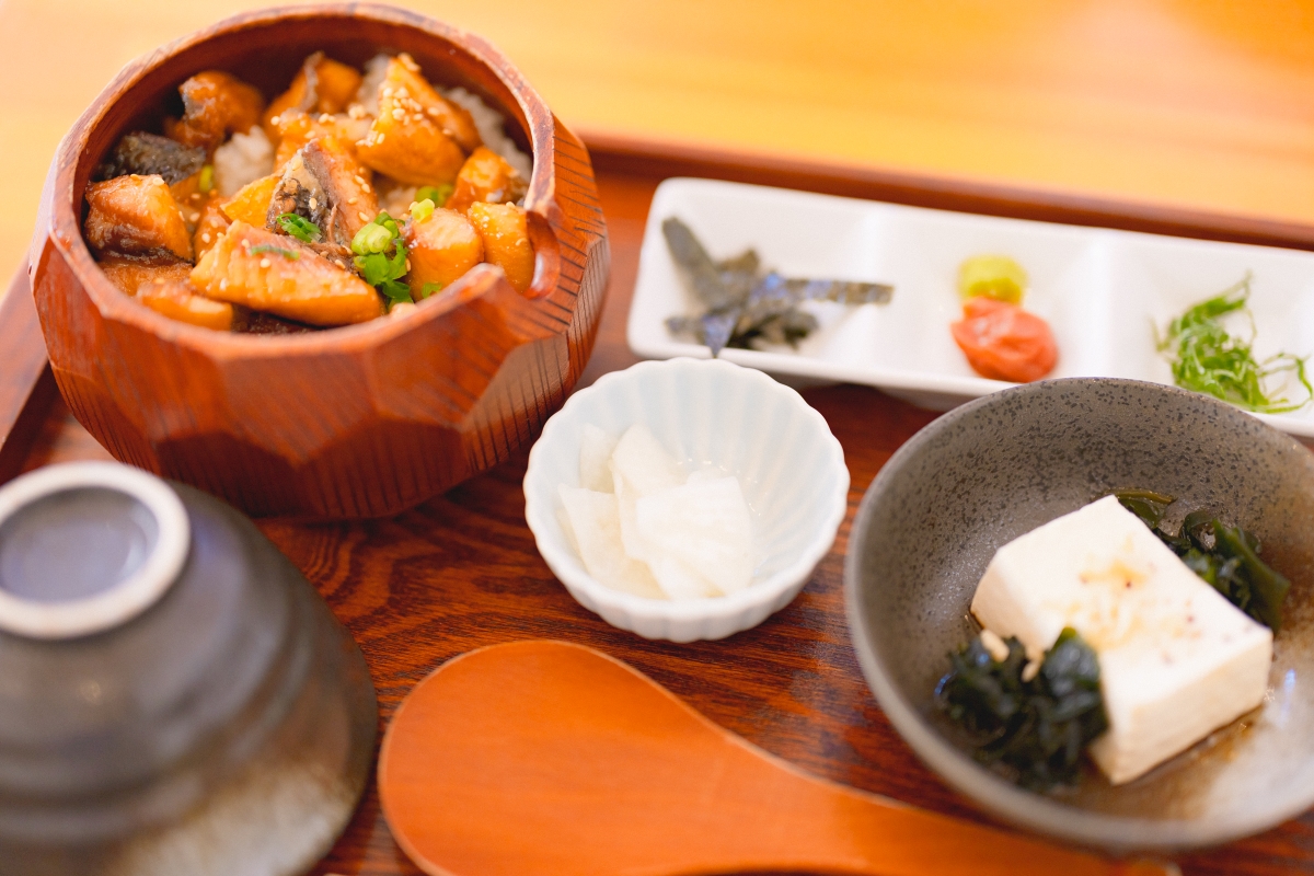 定食やパスタを提供する「定食・ぱすた かたぎりさん」では、この店オリジナルのとびうおひつまぶしをぜひ味わってみてください。醤油だれの絡むトビウオの身にあごだしのだし汁を注ぎ、味のコントラストを堪能できます。自家製デザートも人気で、この日は青じそのシャーベットと島バナナのパウンドケーキでした。